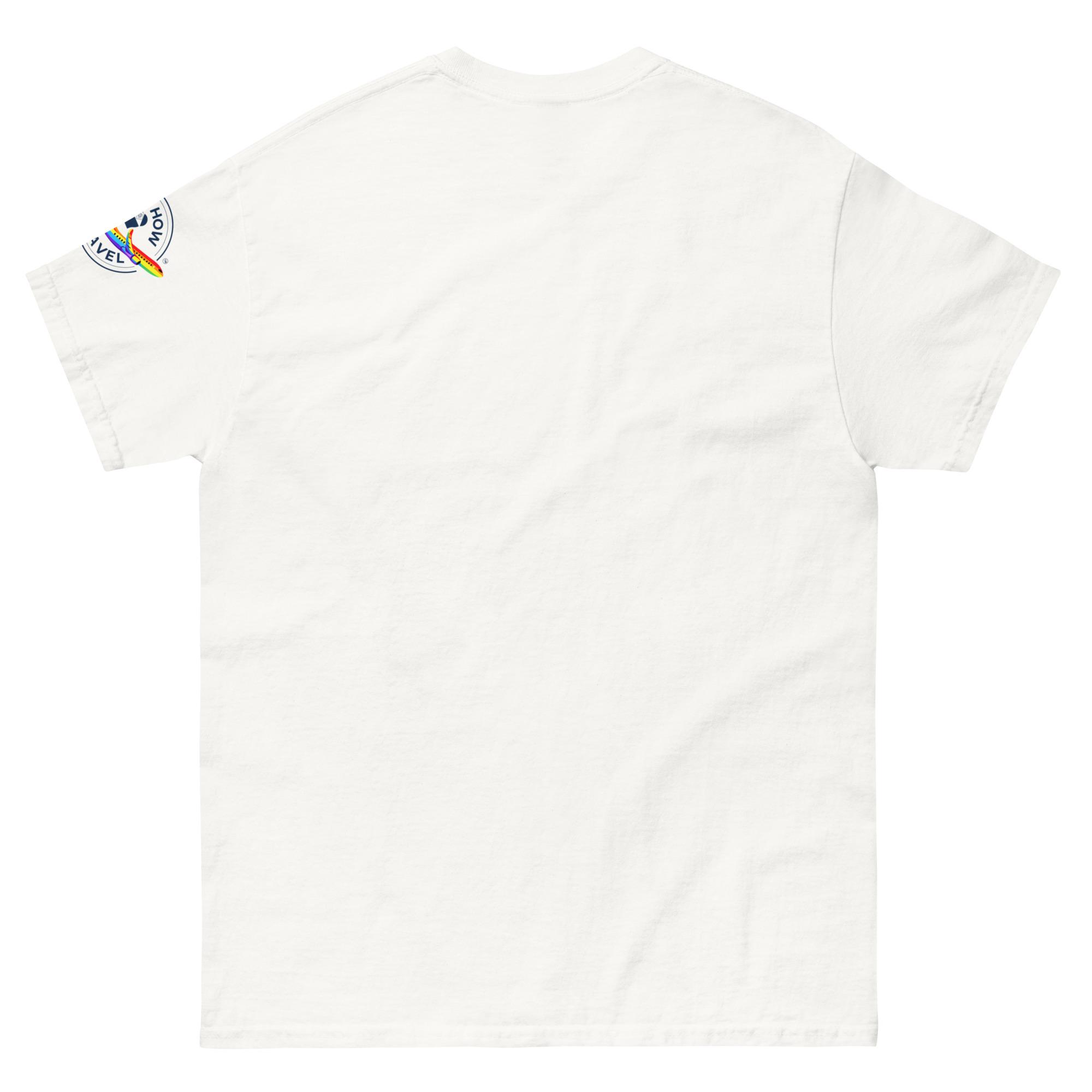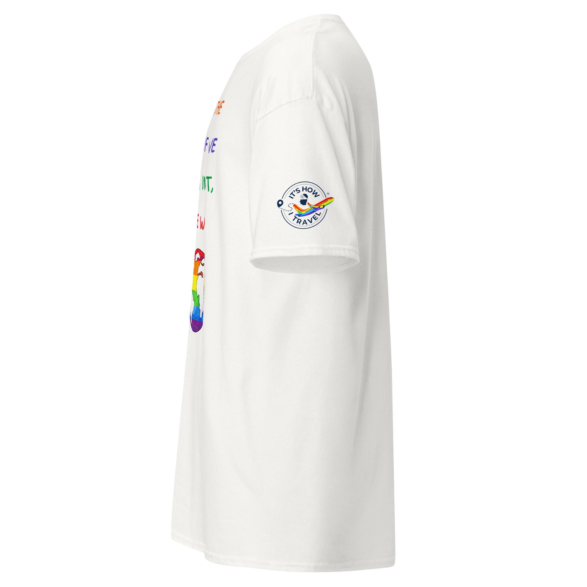 Shirt features a vibrant rainbow globe design celebrating inclusive travel!